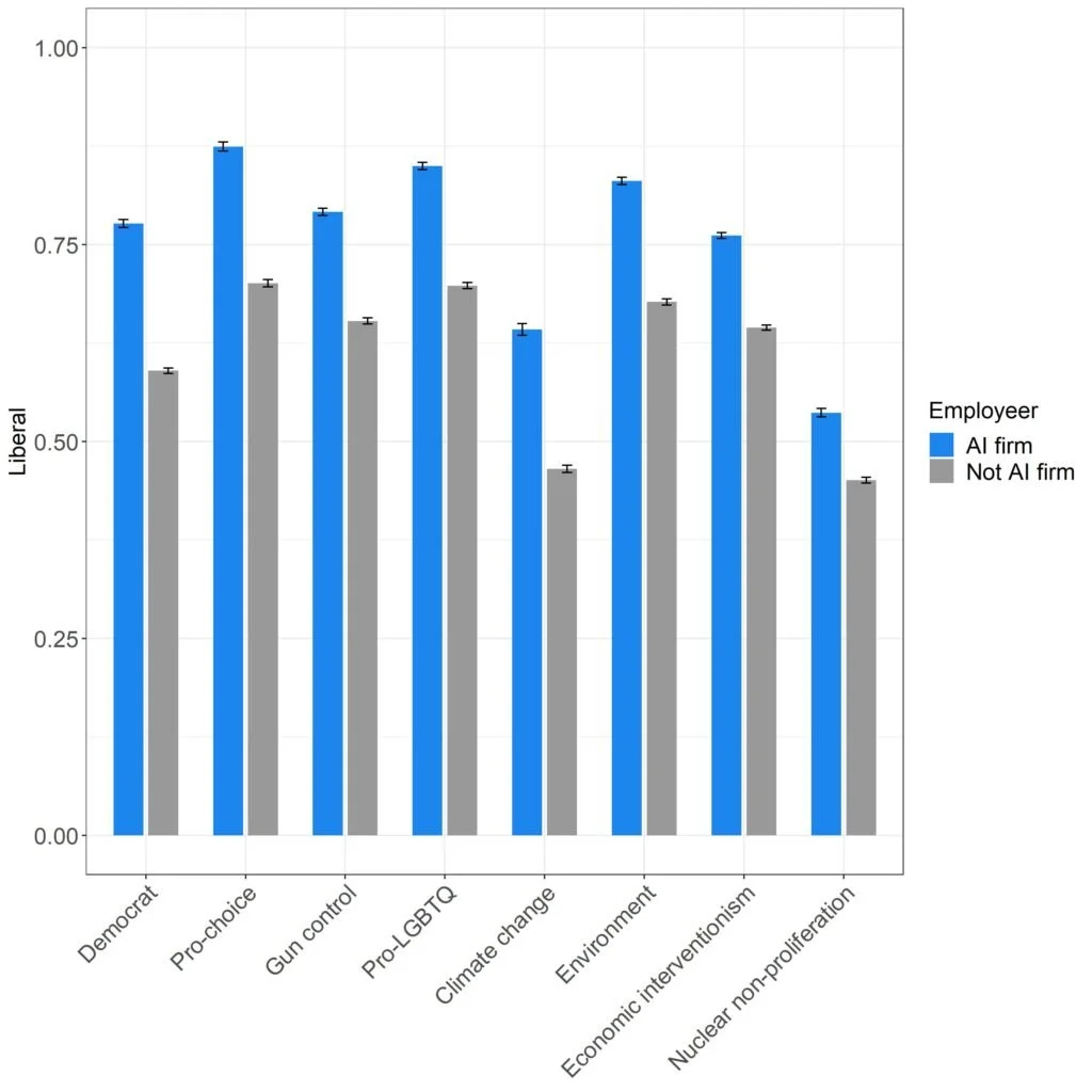 Figure 1: Average positions of political candidates supported by employees of AI firms and employees of other firms. A higher score indicates a more liberal position (95 percent confidence interval).